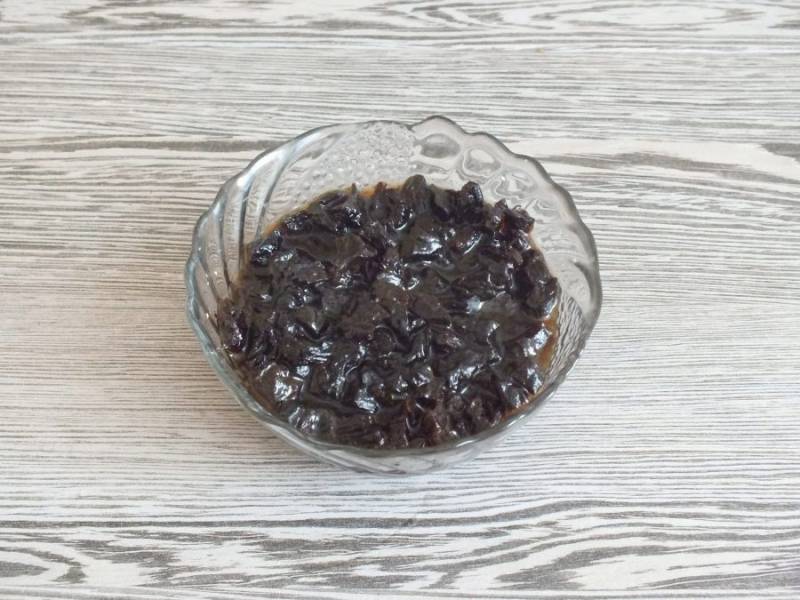 Вымойте чернослив. Нарежьте его как можно мельче, залейте тёплым кофе и оставьте на 40 минут.