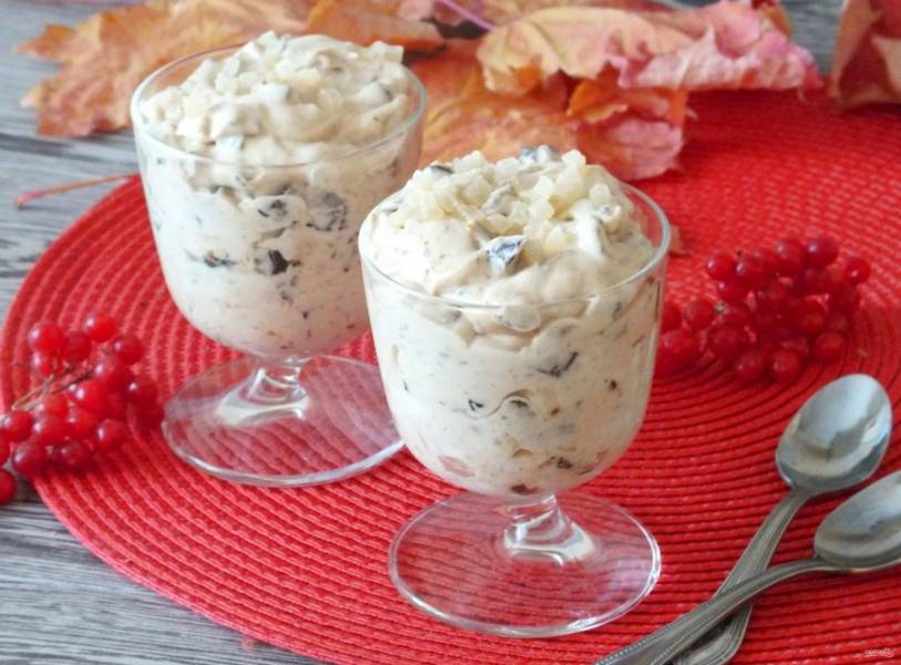Ложкой перемешайте чернослив со сметанной массой. Сильно взбивать не нужно.