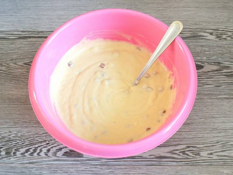 Введите муку за четыре раза, после каждого раза хорошо перемешивайте. В самом конце добавьте разрыхлитель и изюм. Изюм замачивать предварительно не нужно.