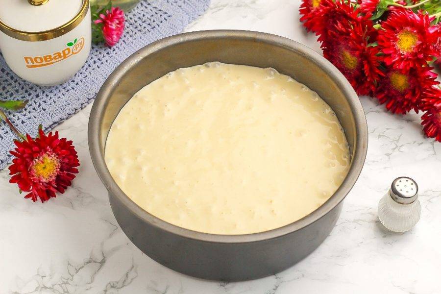 Смажьте форму для выпекания растительным маслом на дне и на бортиках, выложите в нее тесто и разровняйте.