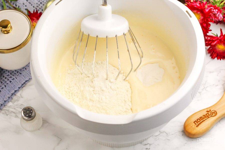 Всыпьте пшеничную муку высшего сорта по частям и разрыхлитель. Вмешайте их венчиком, но не взбивайте, получая не слишком густое бисквитное тесто.