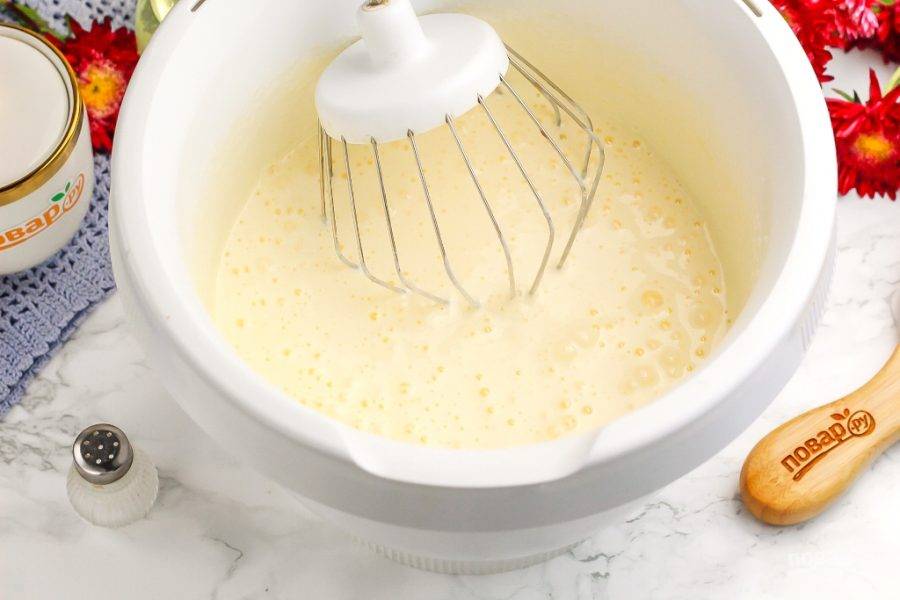 Куриные яйца вбейте в чашу миксера или кухонного комбайна, всыпьте сахар и соль. Взбейте 3-4 минуты на высокой скорости техники. Постарайтесь не перевзбить яичную массу, чтобы она не расслоилась, иначе пирог уже не получится.