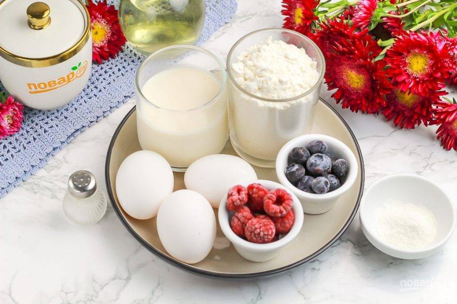 Подготовьте указанные продукты. Сметану заранее извлеките из холодильника, чтобы она прогрелась при комнатной температуре хотя бы полчаса. Ягоды промойте, удалите хвостики и подсушите бумажными салфетками, удаляя лишнюю влагу.