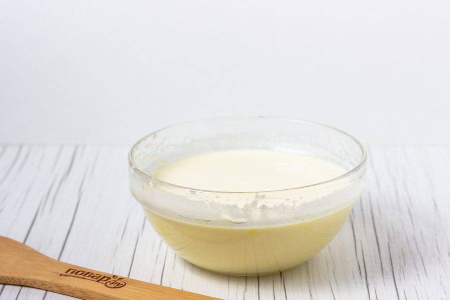 Чтобы крем не получился жидкий, добавьте загуститель для сливок или сметаны. Необходимое количество загустителя смотрите на упаковке. Миксером взбейте все ингредиенты для крема – сметану, сахарную пудру, загуститель и лимонный сок. Готовый крем уберите под крышкой в холодильник, до времени, когда он понадобится.