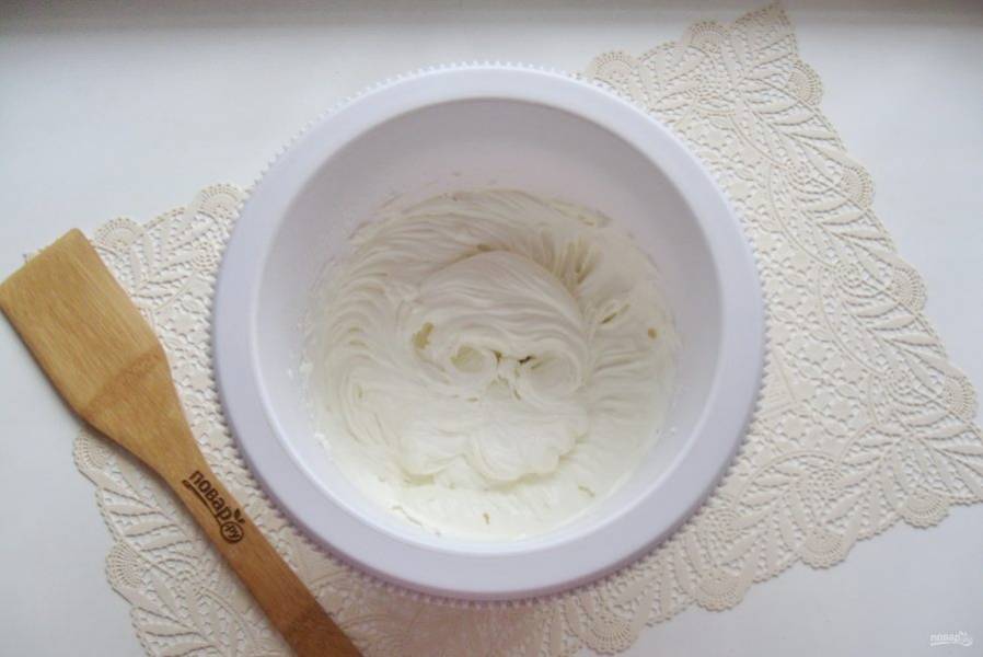 Приготовьте крем для торта. В миску выложите жирную сметану. Добавьте сахарную пудру и ванильный сахар.