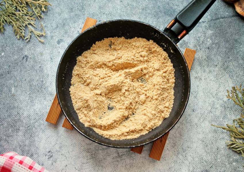 Влейте в сковороду растительное масло и перемешайте. Манка станет напоминать сухой песок. Снимите сковороду с огня и остудите.