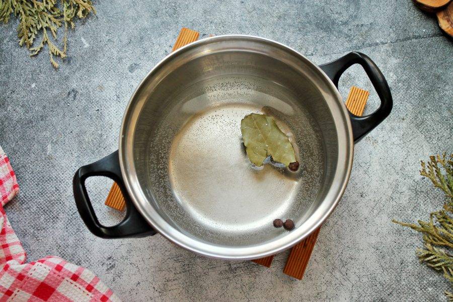 В кастрюлю налейте воду, посолите, добавьте лавровый лист, перец и доведите до кипения. Варите все в течение пяти минут.