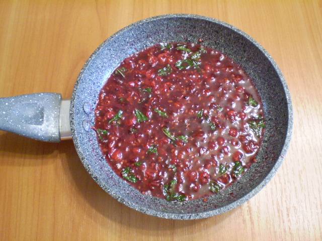 7. Добавляем мяту. И на среднем огне без крышки тушим соус до желаемой густоты.