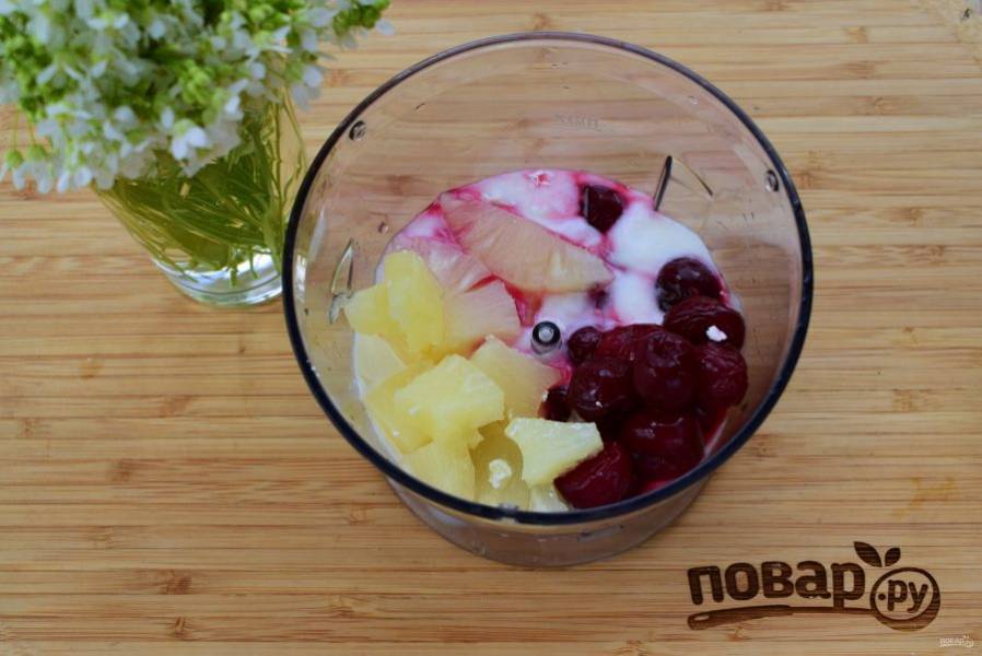 2. Вишнево-ананасовый смузи. Йогурт, вишню без косточек, кусочки ананаса соедините в блендере, взбейте до однородности. Добавьте мед или сахар по вкусу.