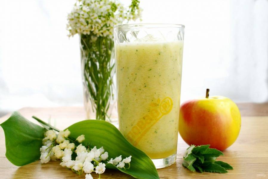 1. Ананасово-яблочный смузи. Ананас и очищенное яблоко нарежьте мелкими кусочками, мяту измельчите. Влейте ананасовый сок, измельчите все с помощью блендера до однородности.