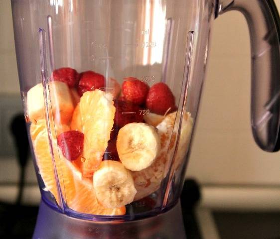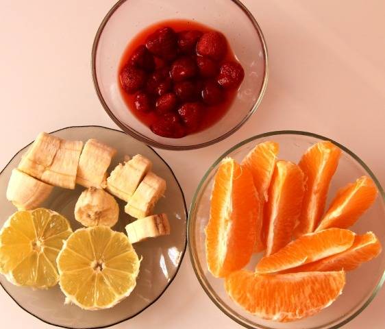 Подготовим фрукты. Очистим банан, лимон и апельсин, нарежем на небольшие кусочки. Если у вас замороженная клубника - лучше ее разморозить.
