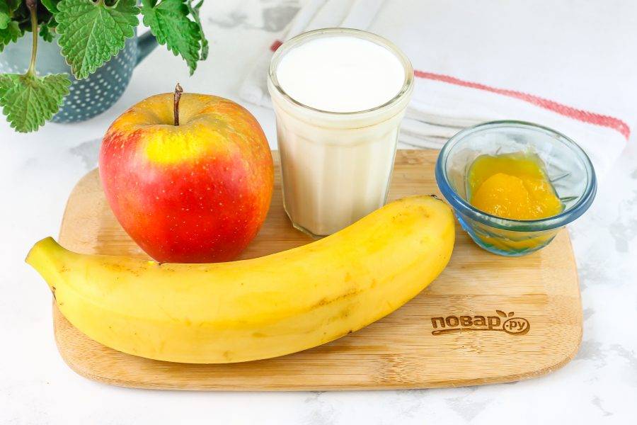 Очистите фрукты от кожуры, промойте яблоко и нарежьте мякоть в чашу блендера. Банан нарежьте небольшими кубиками и также добавьте в чашу блендера. Влейте кефир любой жирности. Так как кефир кисловатый на вкус, он как раз нивелирует сладость фруктов. Создавая смузи из молока, исключите мед из списка продуктов.