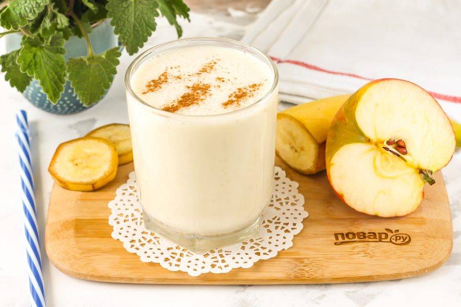 Перелейте приготовленный смузи в стакан или чашку, присыпьте сверху молотой корицей и подайте к столу.