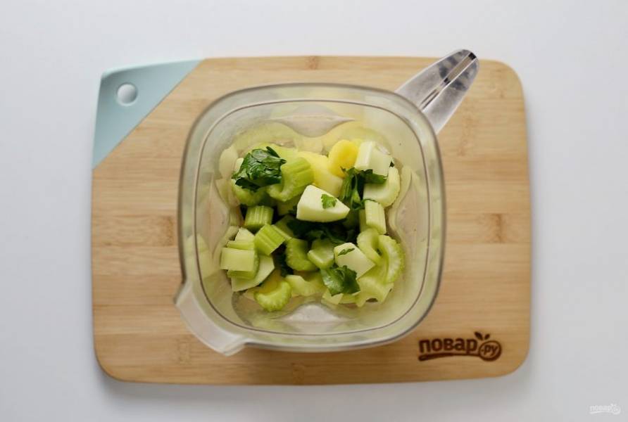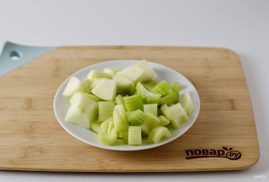 Сельдерей помойте, нарежьте брусочками. Яблоко очистите от кожуры, нарежьте кубиками.