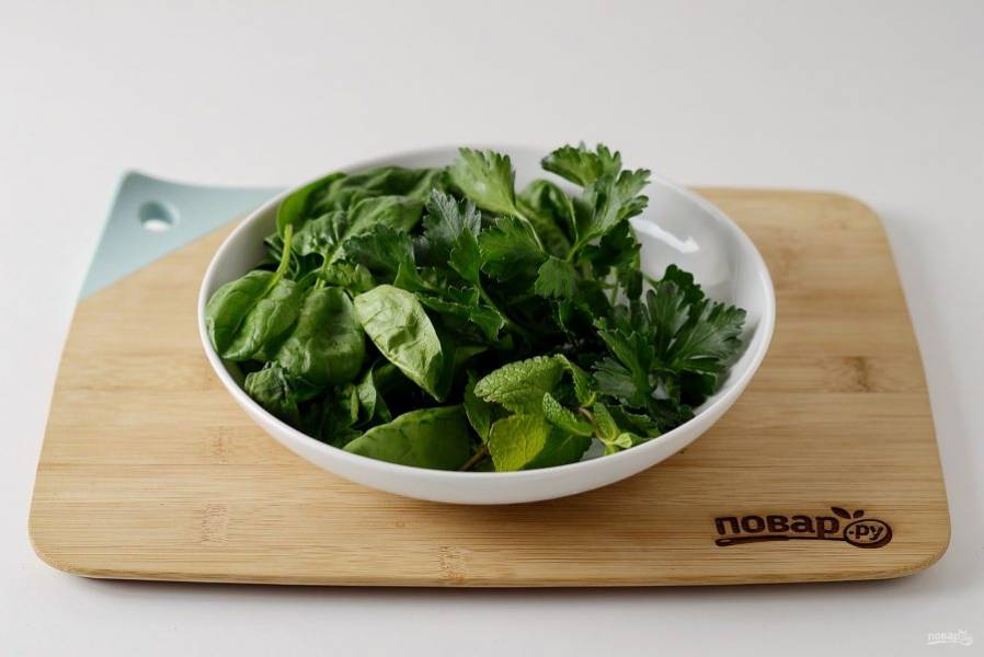 Зелень помойте, обсушите. При необходимости крупно порубите, чтобы было проще измельчать.