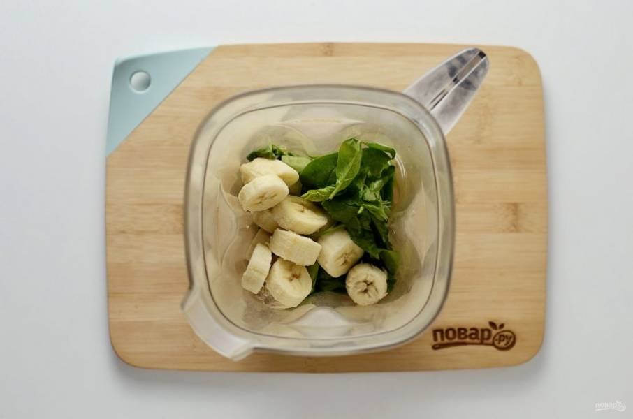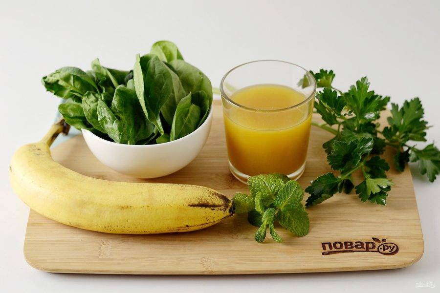 Измельчите в блендере банан с зеленью, затем влейте сок манго до желаемой консистенции и снова взбейте.