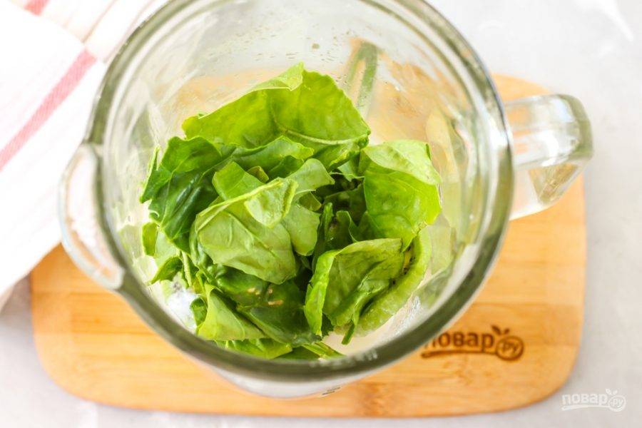 Промойте листья шпината, оборвите стебли и нарвите их руками в чашу блендера.