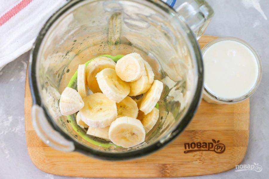 Банан очистите от кожуры, нарежьте шайбочками и высыпьте их в чашу блендера или в глубокую емкость ,если будете использовать погружной блендер, а не кувшинный.