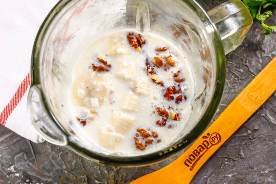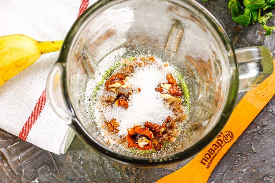 После этого воду из емкости слейте, а набухшую крупу отправьте в чашу блендера.