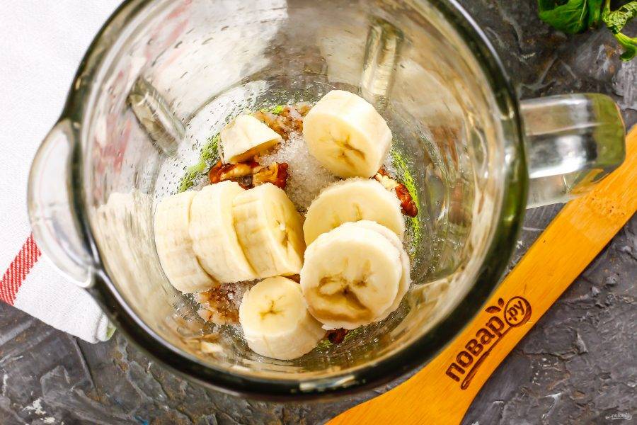 Банан очистите от кожуры, нарежьте мякоть кружочками в емкость.