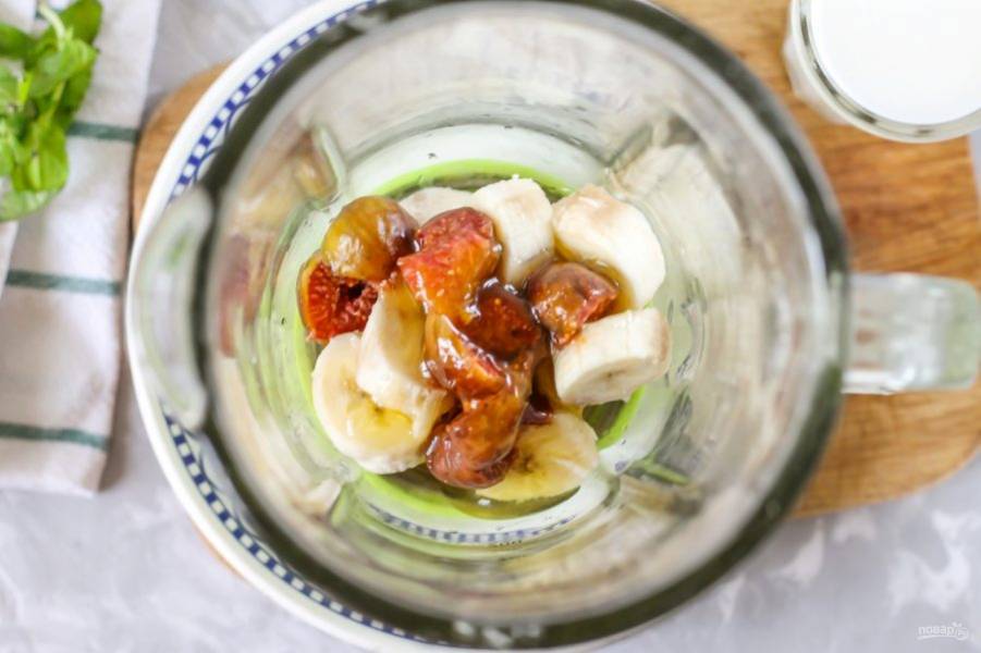 Промойте спелый и сочный инжир. Срежьте с плодов хвостики и нарежьте каждый из них пополам, если плоды небольшого размера, либо на четвертинки, если инжир крупный. Высыпьте нарезку в чашу блендера.