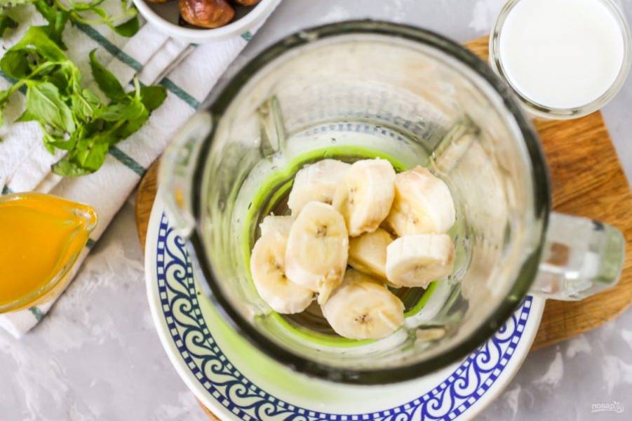 Очистите банан от кожуры, нарежьте шайбочками небольшой толщины, чтобы кусочки фрукта быстрее измельчились в жидкости. Высыпьте банановую нарезку в емкость блендера или в глубокую емкость, если вы собираетесь измельчать все погружным блендером.