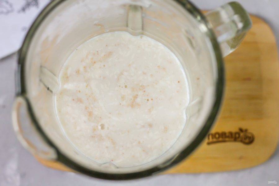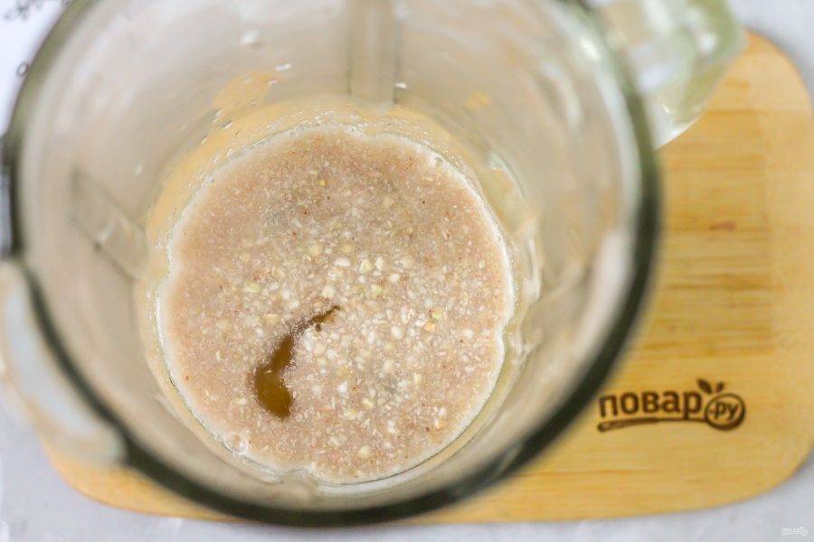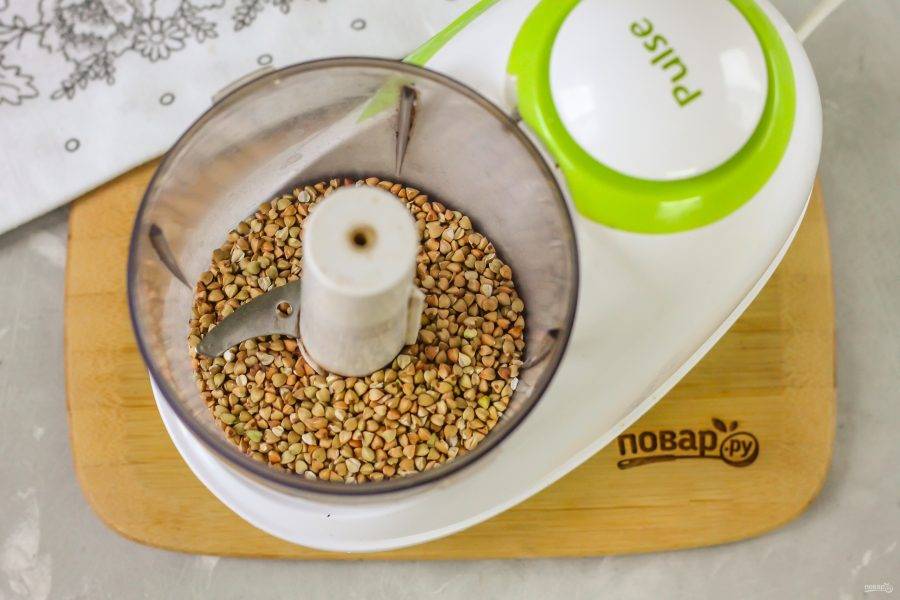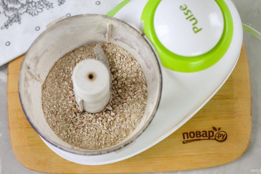 Измельчите примерно 3-4 минуты на пульсирующем режиме. Не обязательно превращать крупу в муку, главное — крупинки должны разломиться.