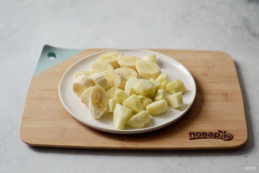Яблоко очистите от кожуры и сердцевины, банан очистите и нарежьте кружочками.