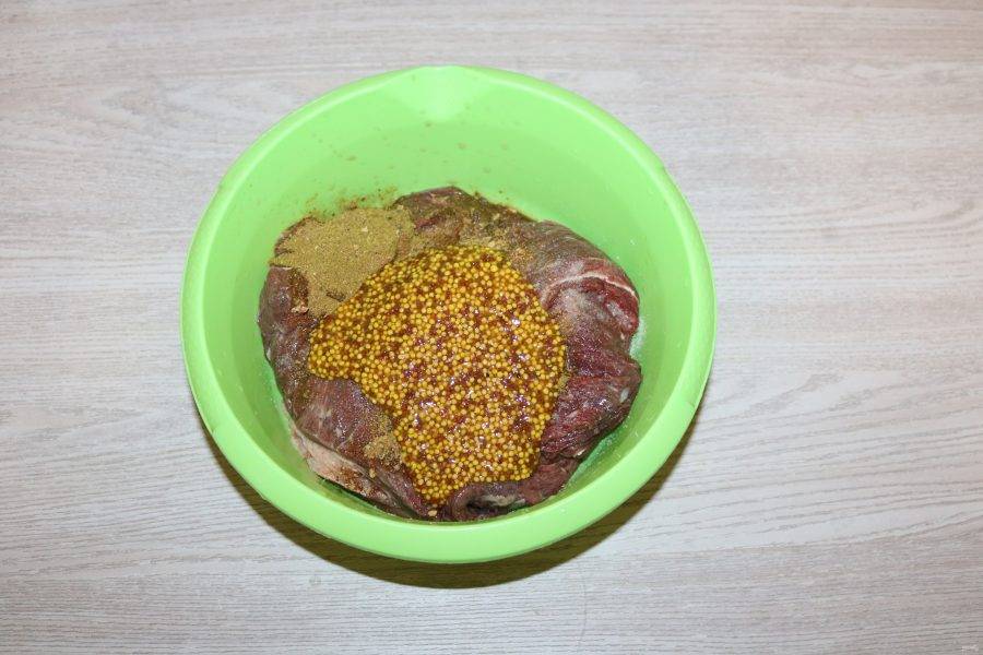 Перемешайте, вотрите специи и горчицу со всех сторон. Накройте пищевой плёнкой, поставьте в холодильник минимум на 12 часов - мариноваться.