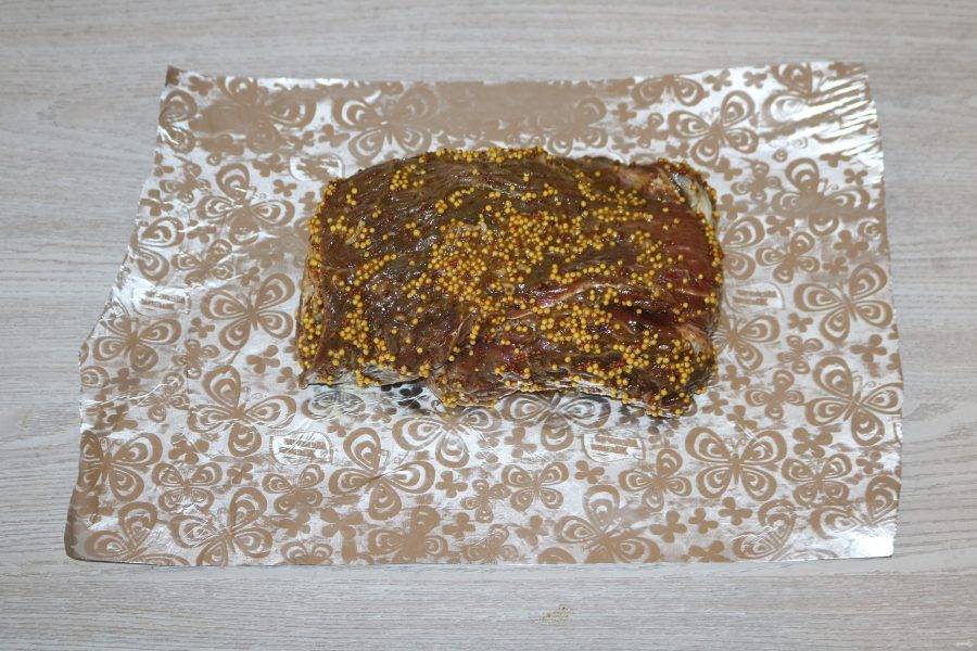 Распределите 2-3 слоя фольги, выложите мясо и плотно заверните.