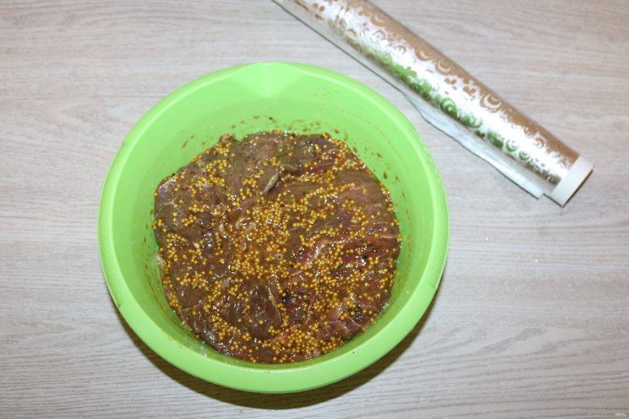 Мясо хорошо промойте, посолите, посыпьте специями, добавьте французскую горчицу, масло.