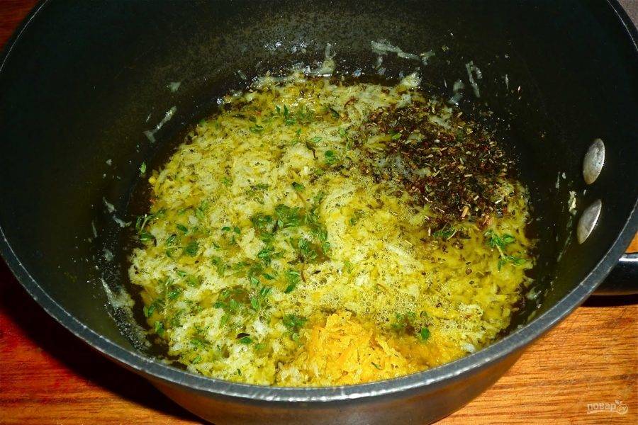 В сотейник влейте масло и положите измельченный чеснок и лук. Обжарьте минуту-две. Затем уберите с огня, влейте вино, добавьте цедру двух лимонов, сок одного лимона, орегано и тимьян, а также соль.