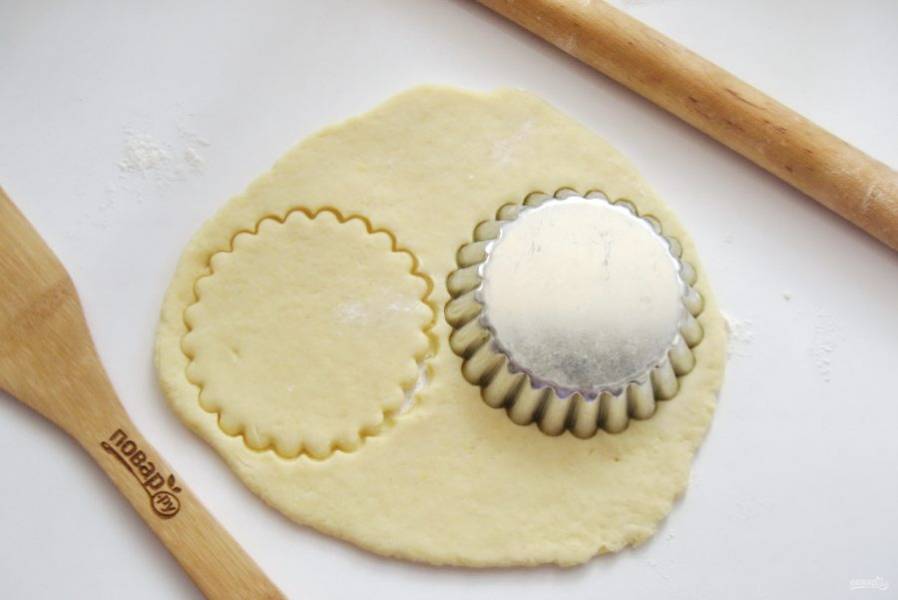 Кусочек теста раскатайте в пласт толщиной 3-5 мм. С помощью формочки вырежьте кружки диаметром 8-10 см.