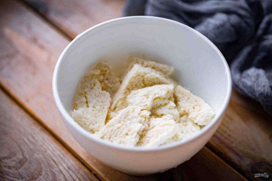 С хлеба срежьте все корочки и мякиш выложите в миску, залейте молоком, оставьте на 15 минут в покое.