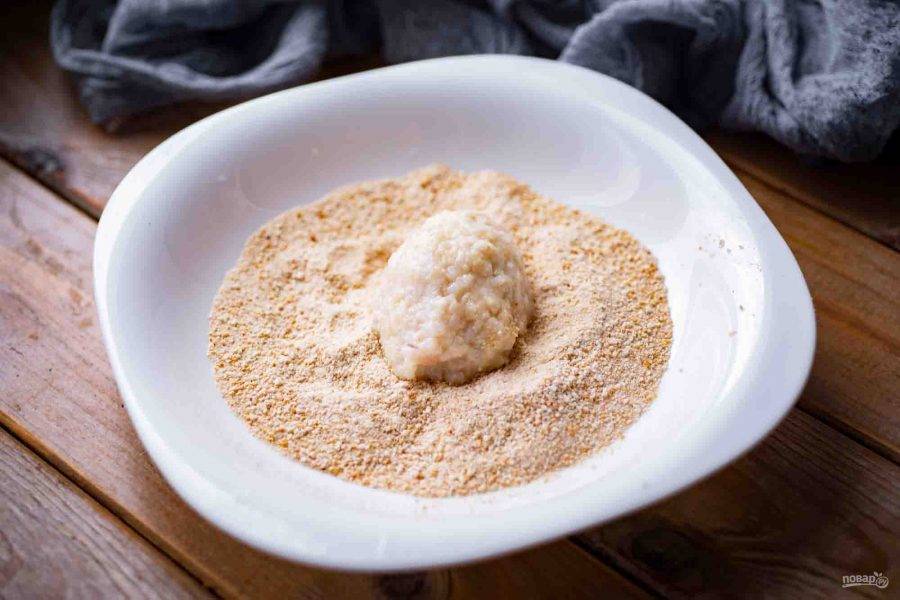 Отделите от общей массы фарша небольшую часть, сформируйте увлажненными руками котлетку, обваляйте в панировочных сухарях. Таким образом подготовьте заготовки котлет из всего фарша.