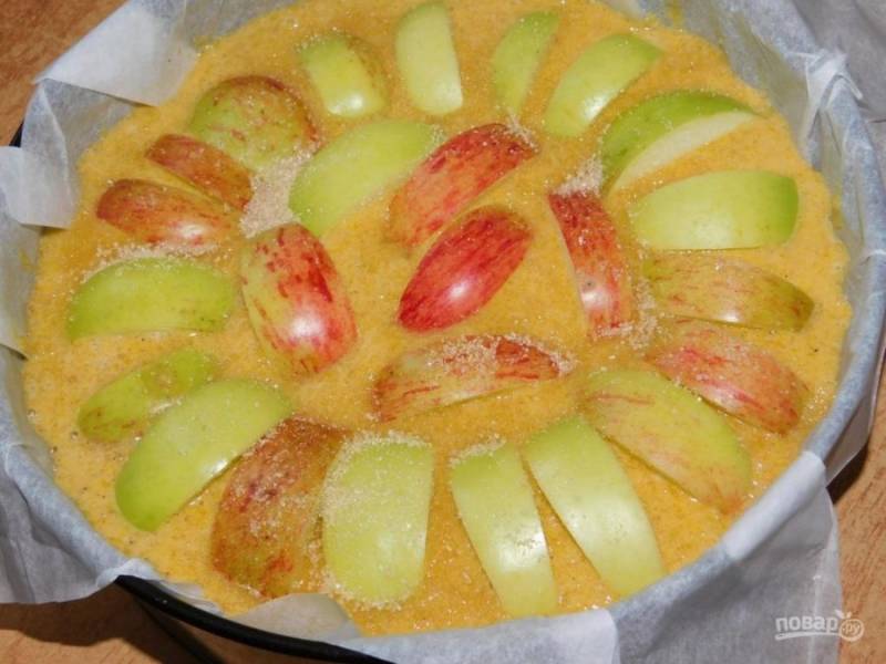Вмешайте в тесто тыквенное пюре. Вылейте тесто в форму для запекания. Сверху выложите нарезанные яблоки. Поставьте в духовку, разогретую до 180 градусов минут на 50-60.