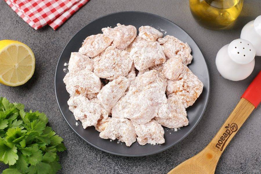 Обваляйте каждый кусочек куриного филе в муке.