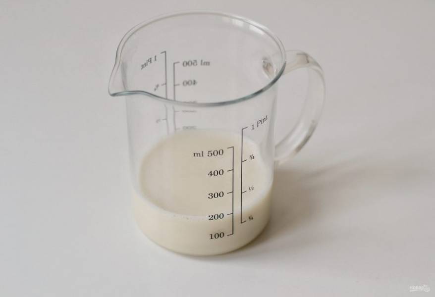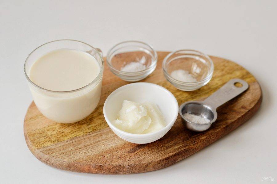 Перелейте соевое молоко в емкость, в которой будете взбивать сметану. Добавьте сахар и соль.