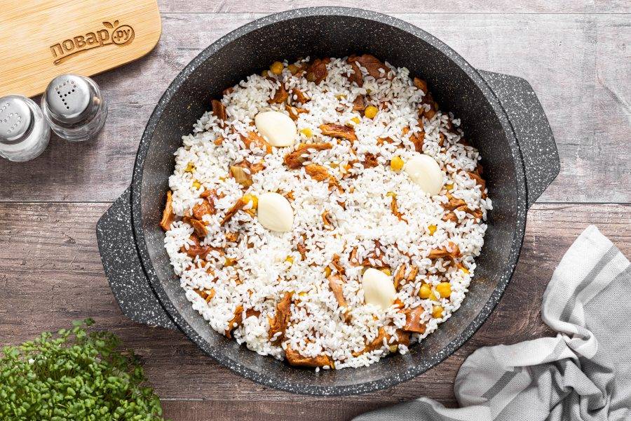 Рис предварительно промойте до прозрачности. Выложите тонким слоем поверх овощей с соевым текстуратом. Добавьте несколько очищенных зубчиков чеснока.