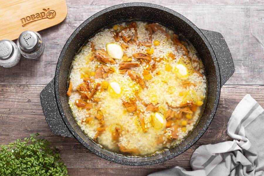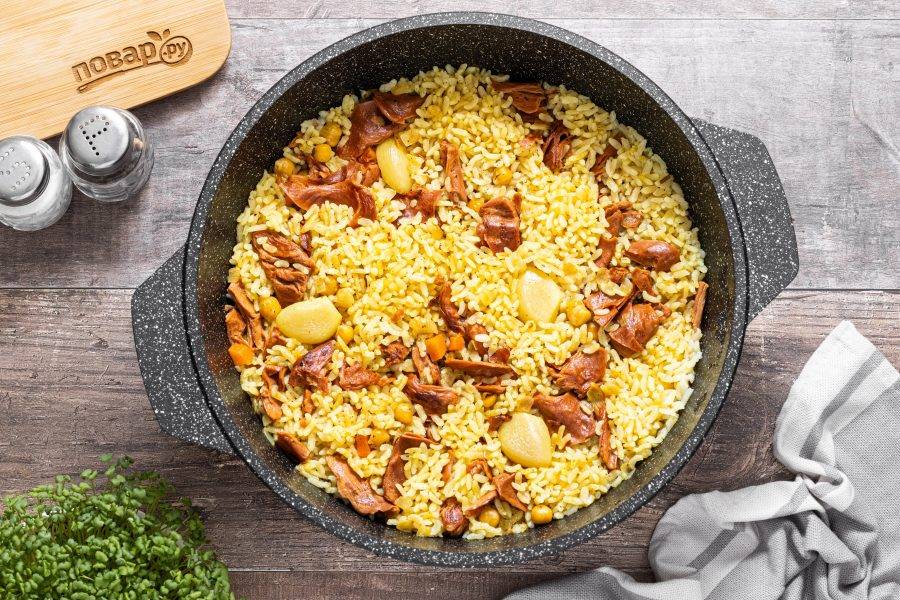 Готовьте плов на медленном огне 20-25 минут под крышкой. После дайте постоять плову еще 10 минут при выключенной плите, затем можно перемешать.