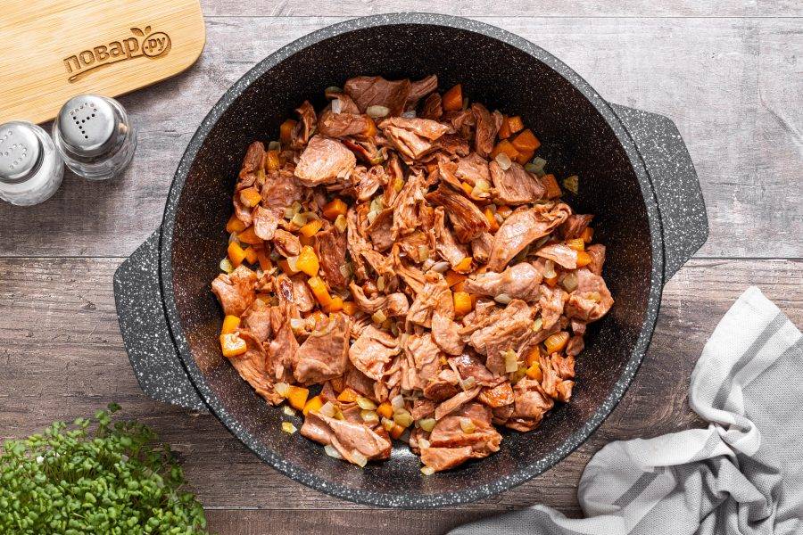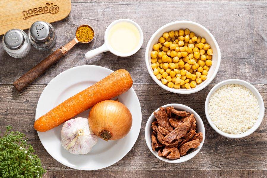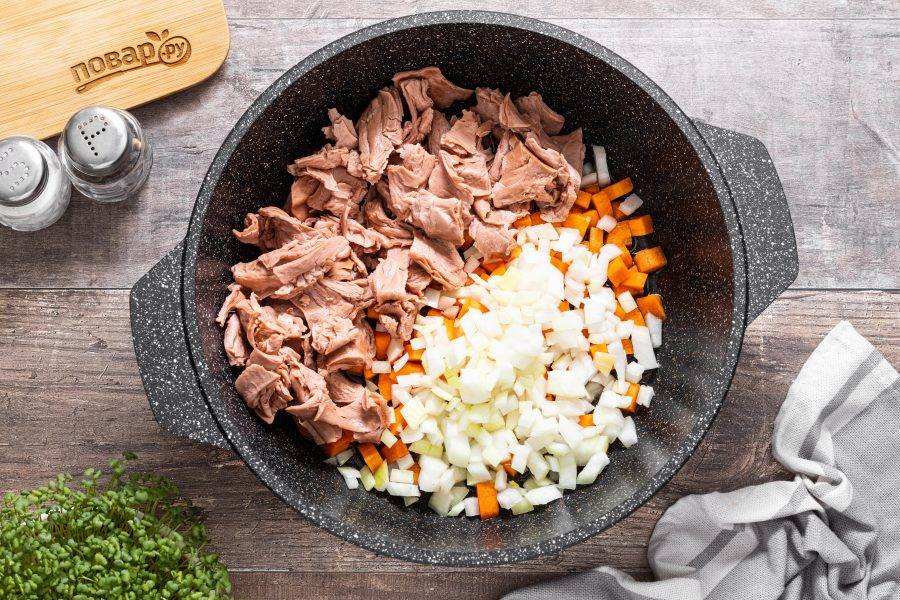 Разогрейте сковороду с толстым дном или казан на среднем огне с растительным маслом. Выложите репчатый лук, морковь и соевый текстурат.