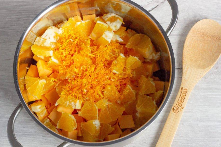 Апельсины помойте, снимите цедру с помощью мелкой терки. Затем удалите оставшуюся кожуру и нарежьте мякоть апельсина кусочками, удаляя косточки. Цедру и мякоть апельсина добавьте к тыкве.