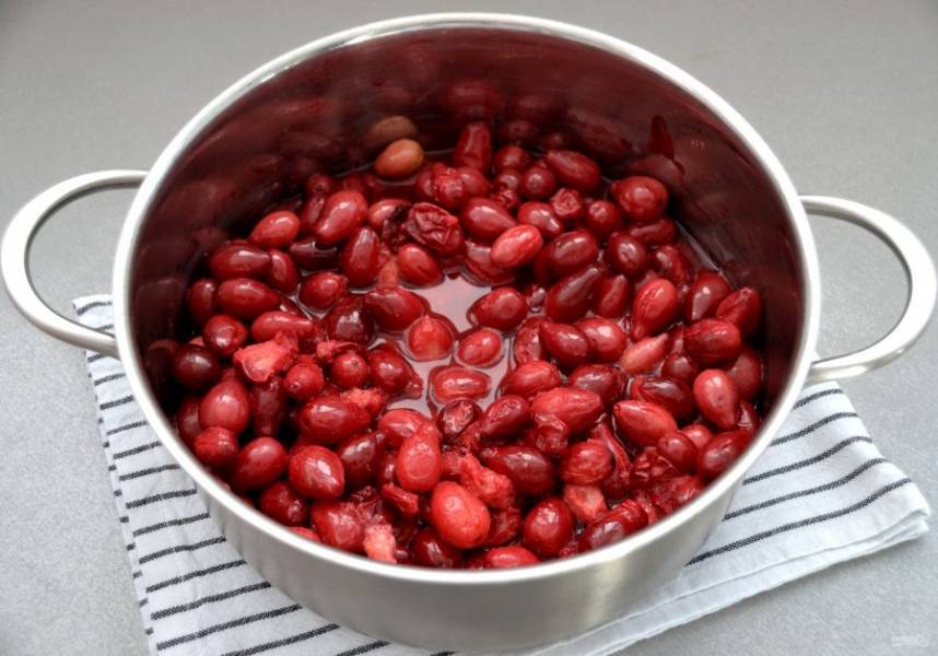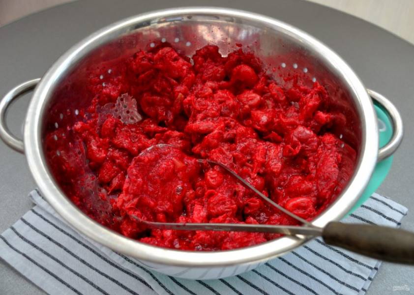 Выложите массу ягод и косточек обратно в сотейник, добавьте примерно два стакана воды, еще раз нагрейте, если масса ягодной мякоти еще не достаточно отделилась от косточек. И снова перетрите через дуршлаг или сито. После этого из оставшегося жмыха можно приготовить очень вкусный напиток.