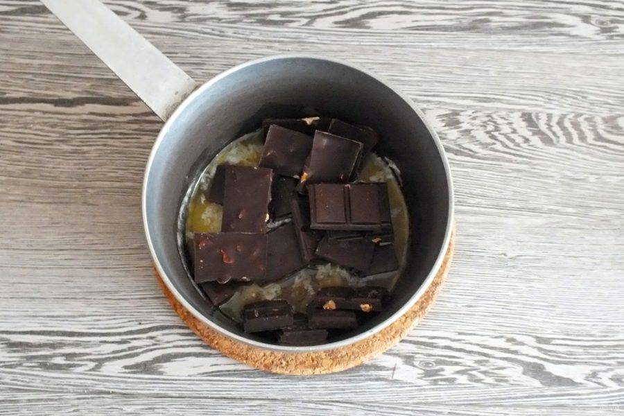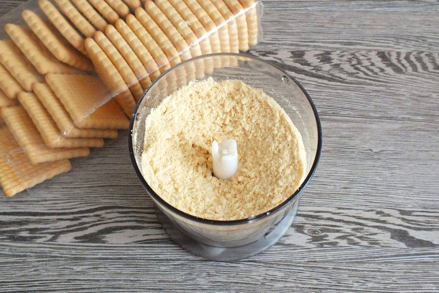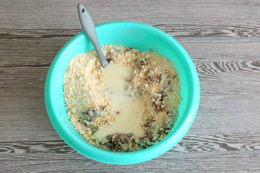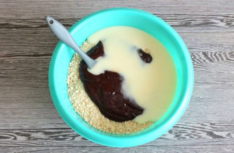 Крошку пересыпьте в просторную чашу, добавьте 2/3 части указанного количества сгущенного молока, растопленные шоколад с маслом.