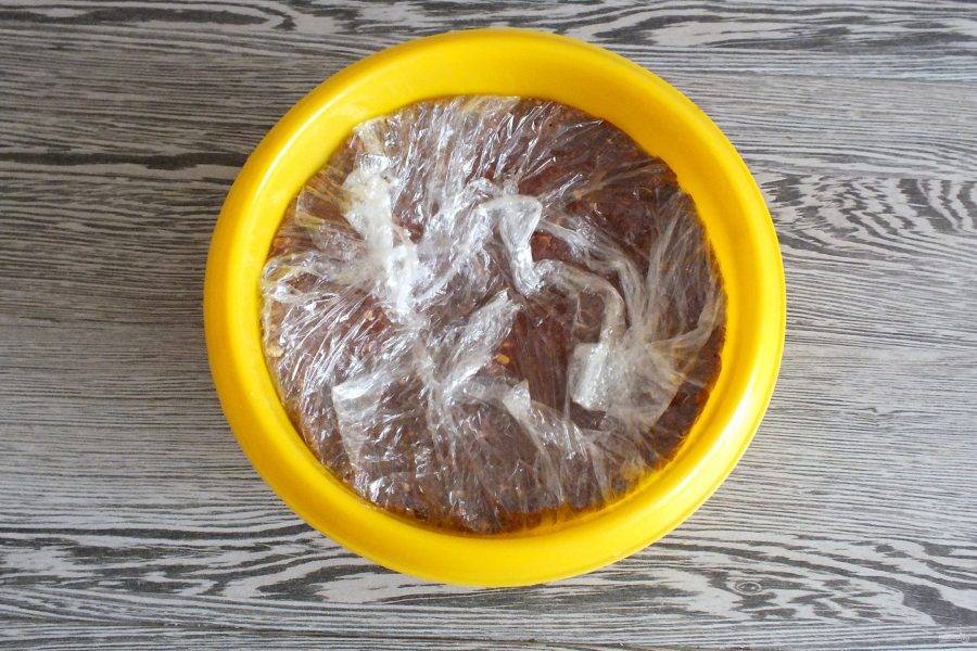 Возьмите чашу чуть меньшего размера. Застелите ее пищевой пленкой (можно фольгой). Выложите подготовленное тесто. Прижмите плотно рукой. Уберите в холодильник на 1 час.