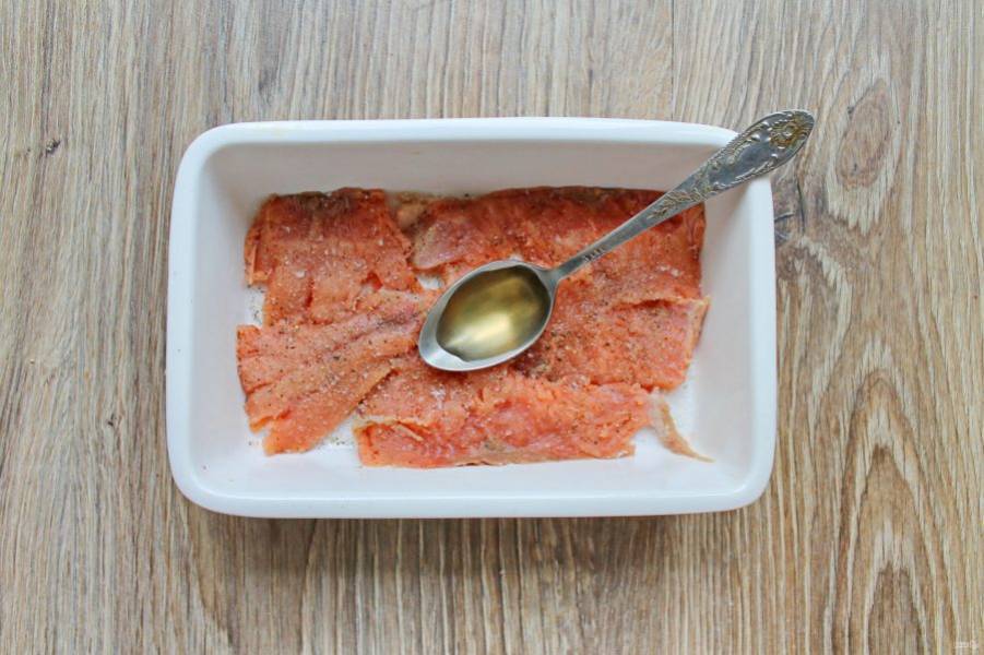 Смешайте сахар и соль. Насыпьте на дно формы смесь тонким слоем и выложите горбушу в один слой. Посыпьте смесью и поперчите.