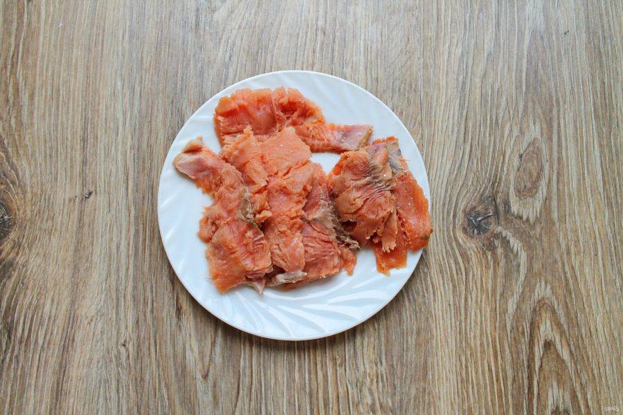 У филе горбуши тщательным образом удалите кости. При помощи острого ножа срежьте филе с кожи тонкими пластинками.