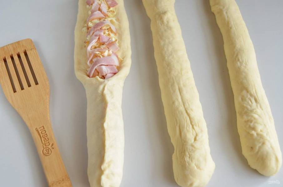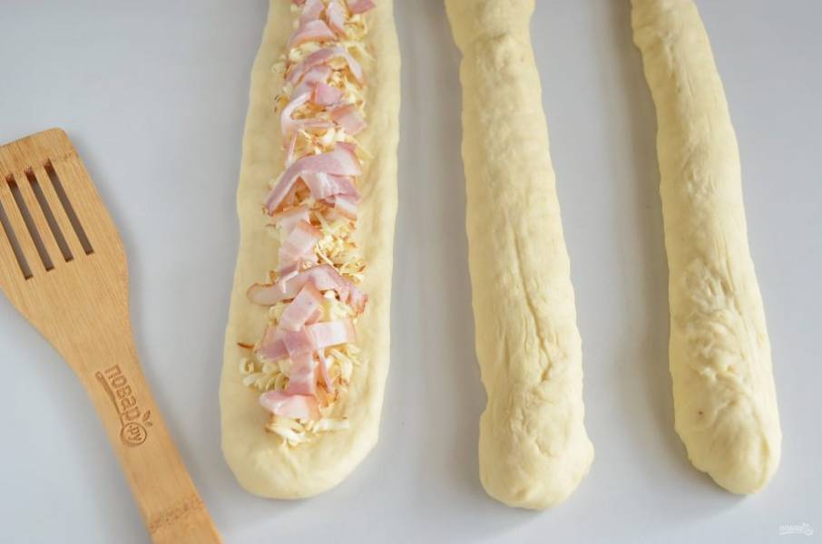 Подошедшее тесто разделите на три части, каждую скатайте в колбаску длиной около 50 см. Пальцами расплющите первую колбаску, положите на неё треть начинки.