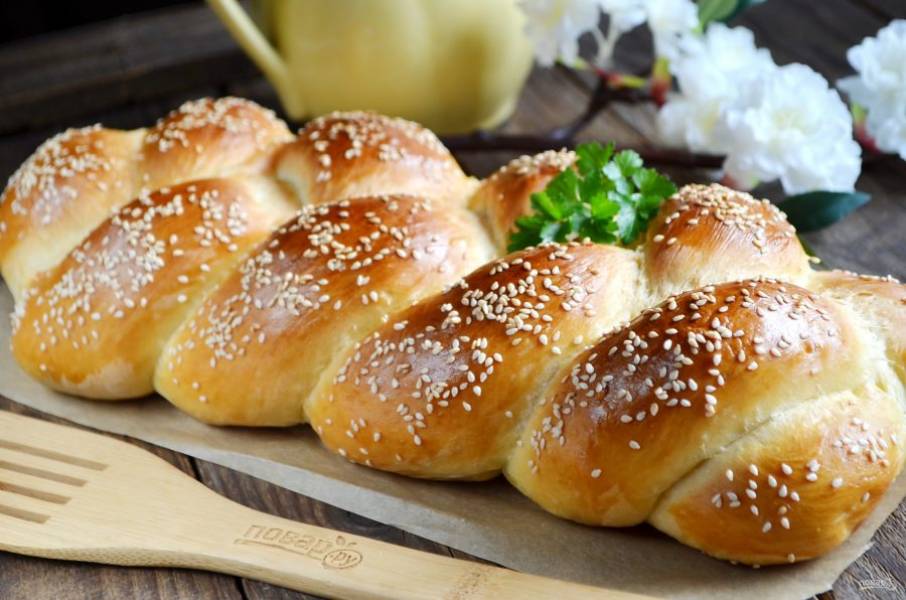 Перенесите косичку на пергамент. Смажьте глазурью (молоко+желток+щепотка соли). По желанию посыпьте кунжутом или семенами подсолнечника. Оставьте на 30-40 минут подходить в тепле.