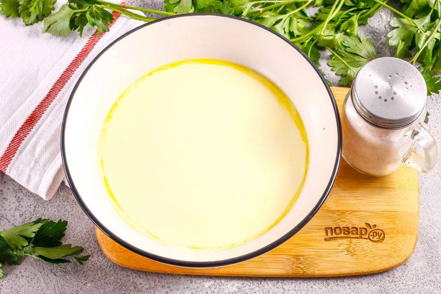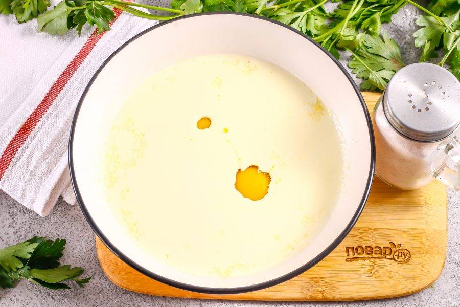 Сливочное масло выложите в глубокую емкость и растопите в микроволновке или на водяной бане, но не до кипения.
